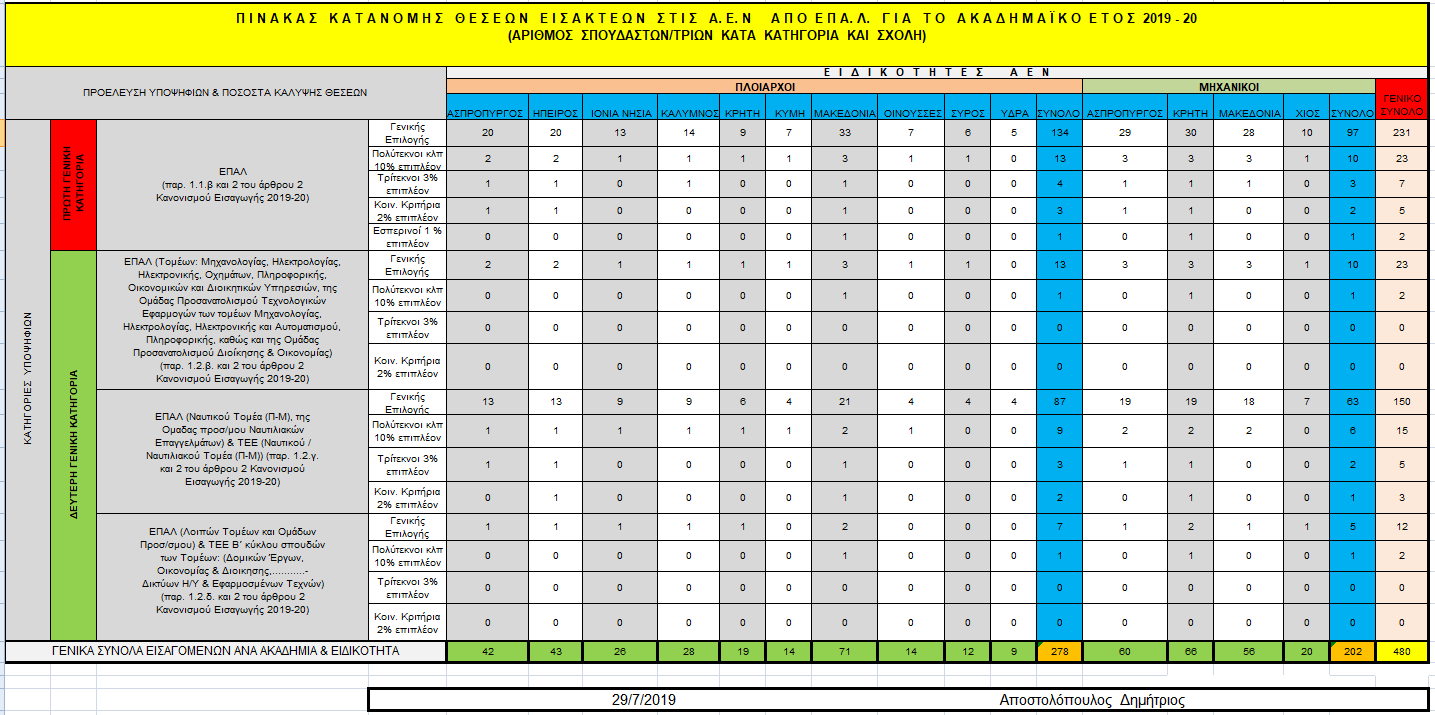Ο αριθµός εισακτέων στις Ακαδημίες Εμπορικού Ναυτικού (ΑΕΝ) για το ακαδηµαϊκό έτος 2019-2020 από ΕΠΑ.Λ. είναι 480 και κατανέμεται ως εξής: